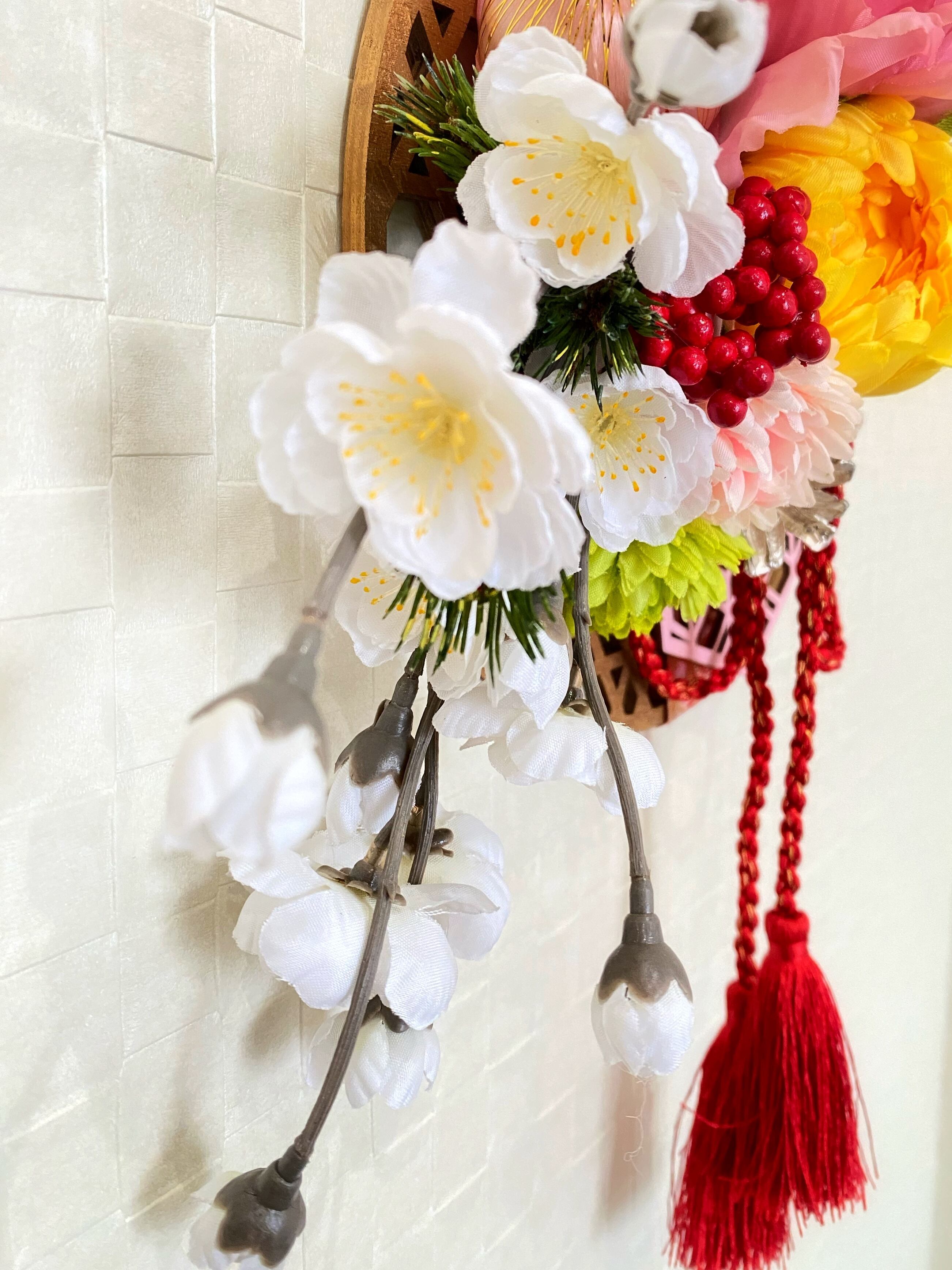 鮮やかな花々が豪華に咲き誇る壁掛けアレンジ。新しい年の始まりを祝福する美しいデザインは、お部屋の雰囲気を一層華やかに彩ります。